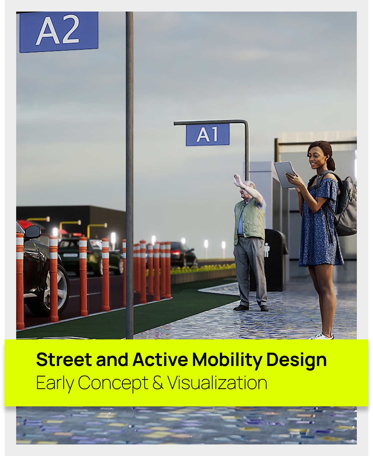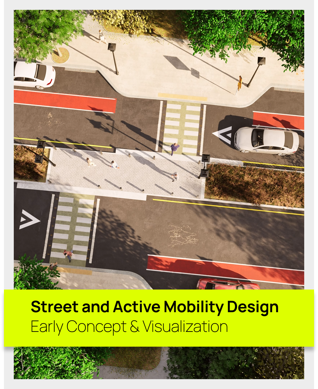 Developed concept design and visualization for a vital urban corridor reimagined as a people-centered street. The plan promotes walkability and active mobility through slow-speed zones, safe midblock crossings, park-assist lanes, landscaped medians, and roundabouts that calm traffic and enhance connectivity.